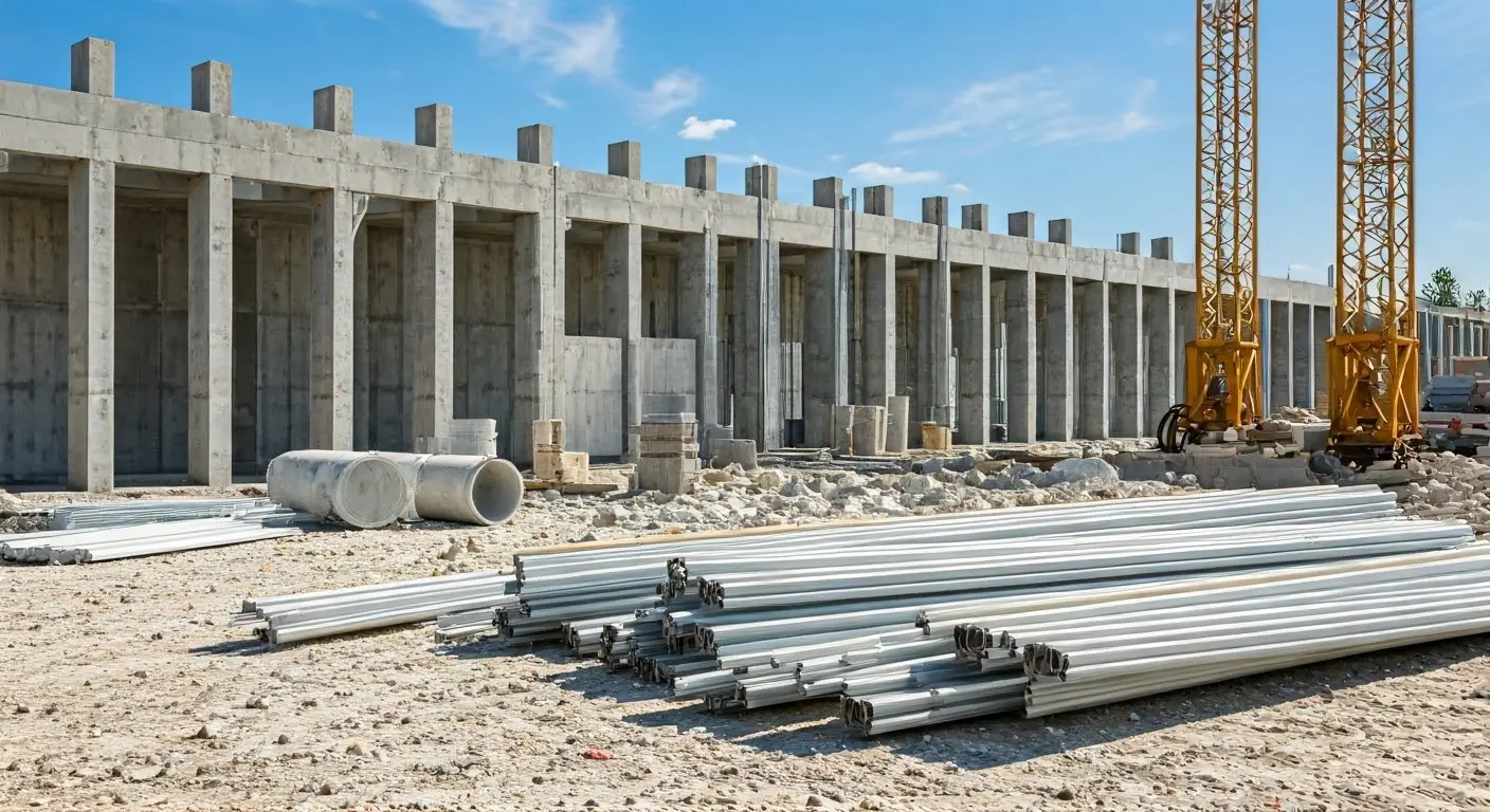 Discover visuals highlighting premium construction materials including pipes, waterproofing products, and bathware that define our quality and commitment.